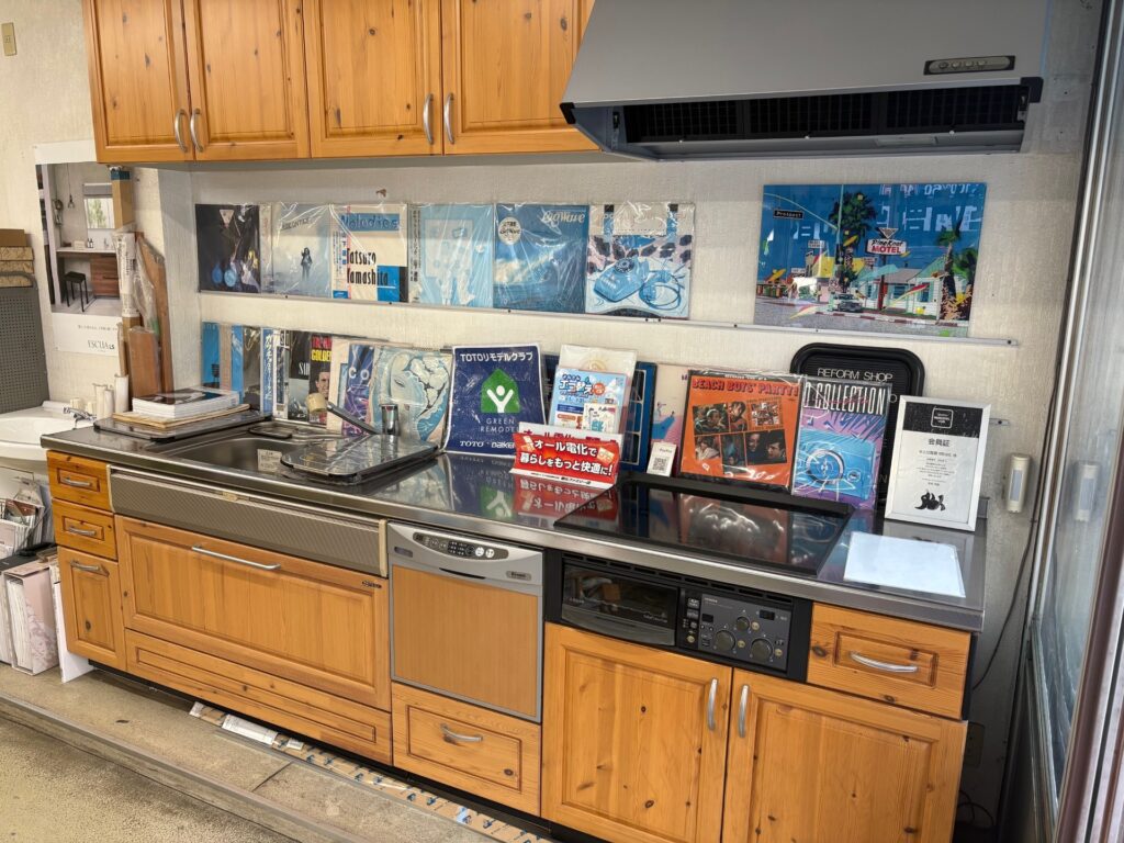 事務所のキッチン上には、ずらっと並ぶお気に入りのジャケットたち。